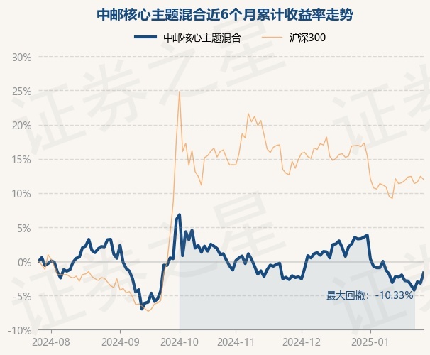 本站消息,1月27日,中邮核心主题混合最新单位净值为1.772元,累计净值为1.932元,较前一交易日上涨1.55%。历史数据显示该基金近1个月下跌4.88%,近3个月下跌2.69%,近6个月下跌1.72%,近1年上涨3.44%。该基金近6个月的累计收益率走势如下图: